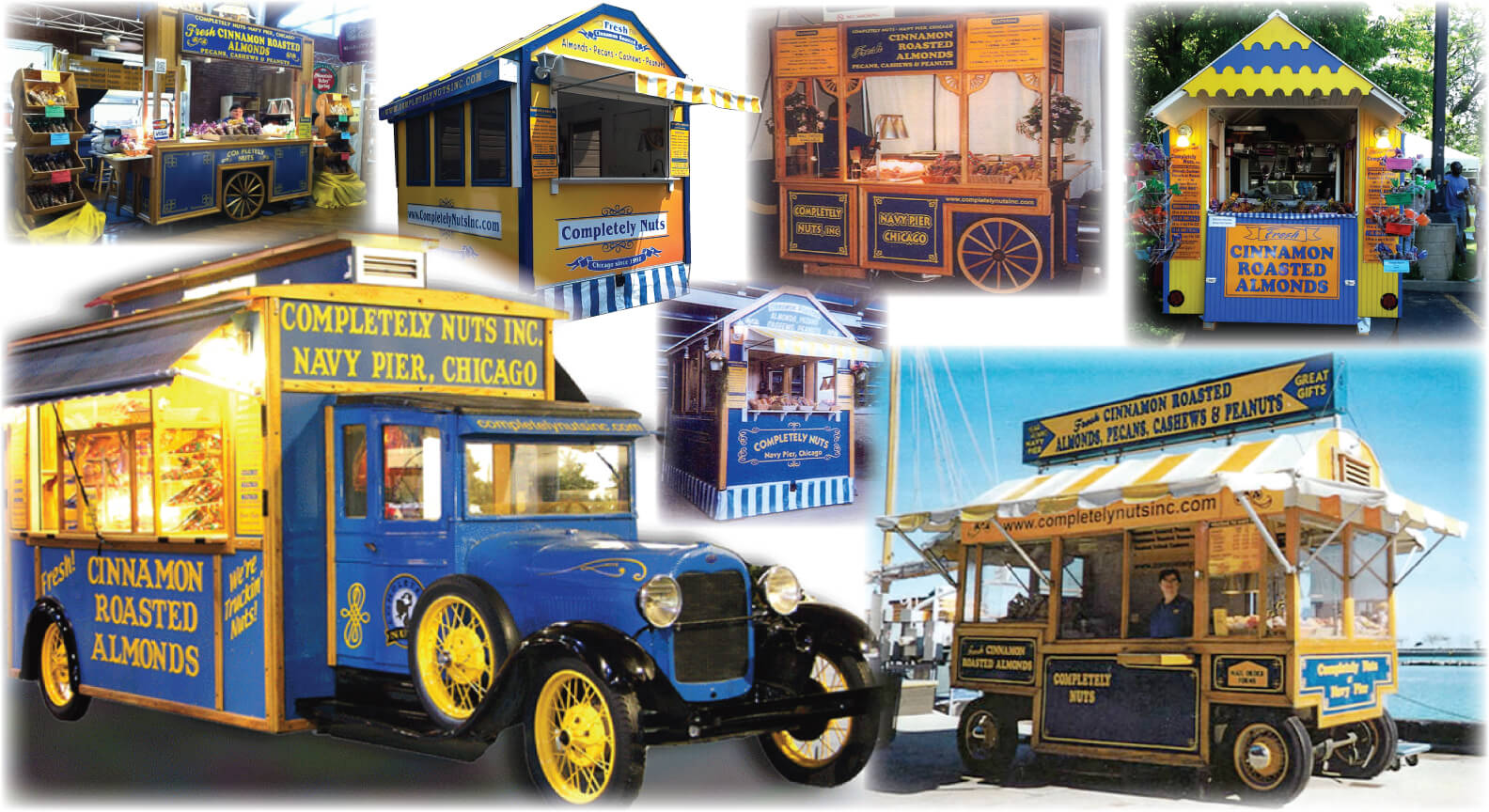 This Product Line Is A Chicago Favorite Cinnamon Roasted Mixed Nuts, Almonds, Cashews, Pecans & Peanuts We roast our delicious Cinnamon Almonds, Cashews, Pecans and Peanuts to ensure freshness in each order. Each batch is roasted to perfection in copper kettles using fresh ground cinnamon, and vanilla. No oils or preservatives are used in our cooking process, ensuring the best products and gourmet flavor that you know us for! Completely Nuts Inc, opened in 1991, with just a roaster at a local fair. Since then we have grown to be nationally known for our premiere products, our outstanding customer service and our commitment to bringing the best to our clients. We take pride in being the best at what we do and offering that to our customers nationwide.We are located year-round at Chicago's world famous Navy Pier, and travel the country with our one-of-a-kind custom built carts to venues near and far.